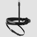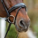 Das anatomische Reithalfter Spezial in glänzendem Lackleder und mit elegantem Zierkeder in schwarz-metallic sieht nicht nur elegant aus. Anatomisch geformt und weich gepolstert ist es auch besonders pferdefreundlich. Als Wechselnasenriemen lässt sich das Reithalfter einfach beidseitig in die passenden Trensen einschnallen.