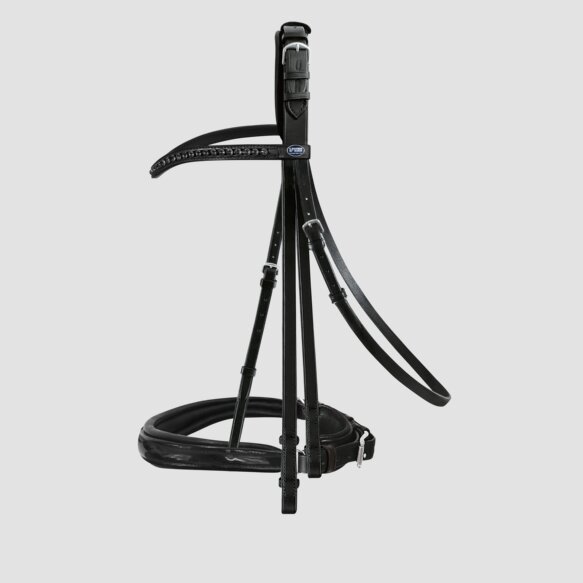 With its black sparkle the Black Luxury Edition of the Hubertus Schmidt Double Bridle is the perfect double bridle for a stunningly glamorous performance. The anatomically-formed, softly lined Passier Caveson Special with patent leather trim is a brilliant highlight, the softly padded head piece of the double bridle allows for individual adjustment on the horse. The waved browband with the dark and mysterious shine of large Premium Crystals in black Graphite completes the elegant look.